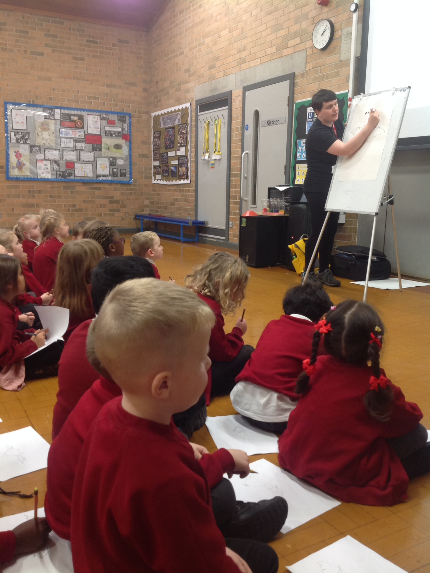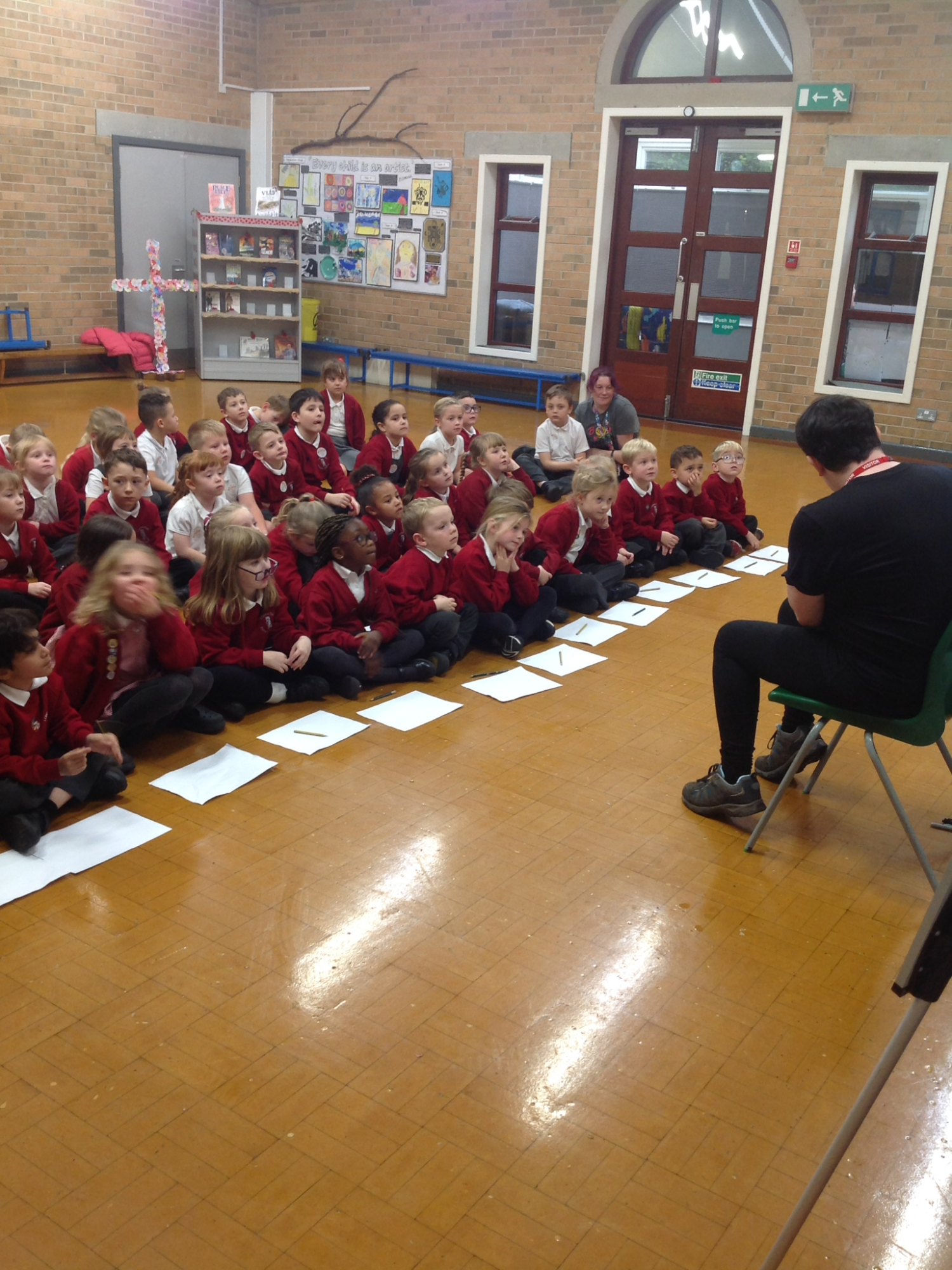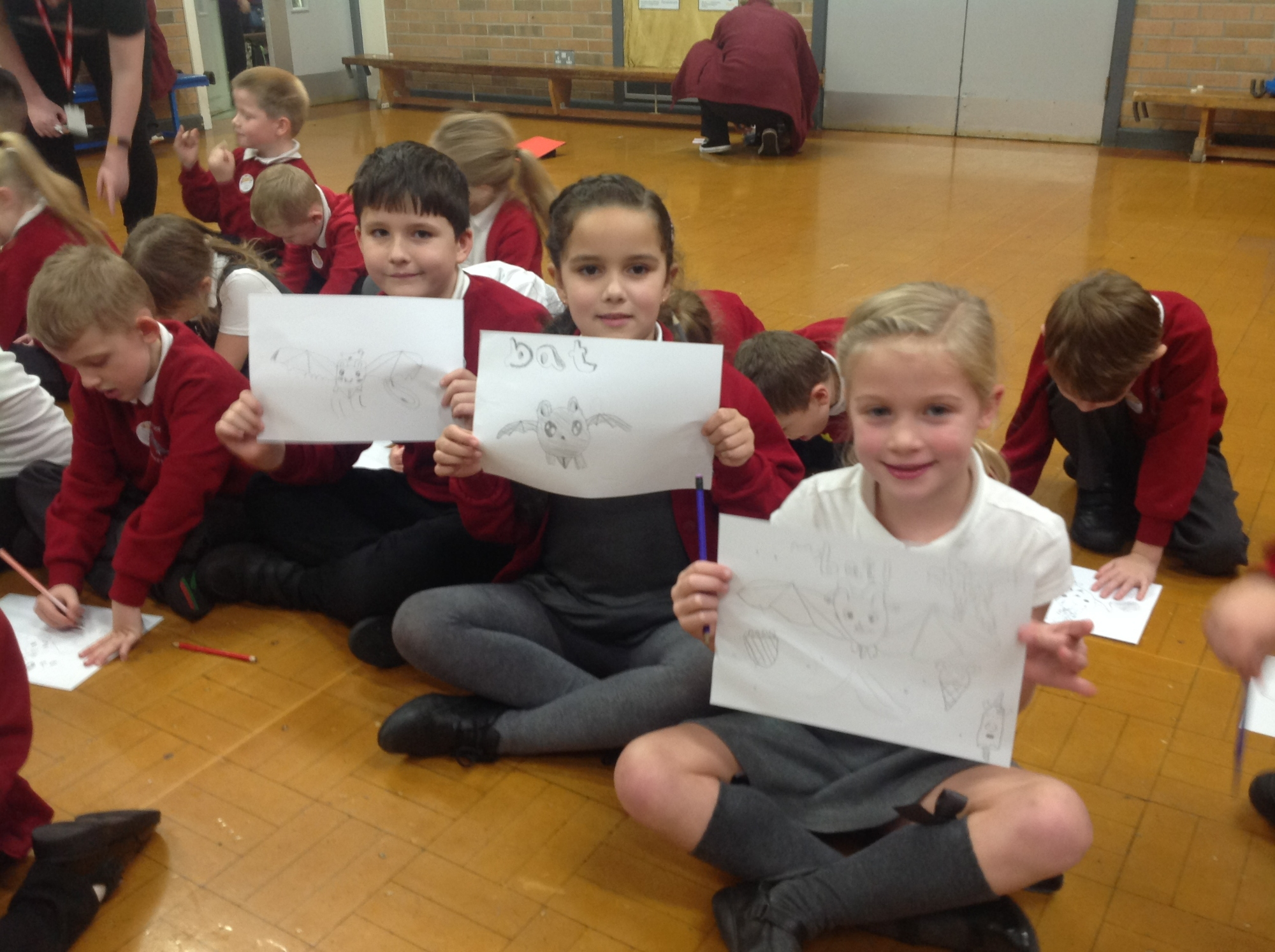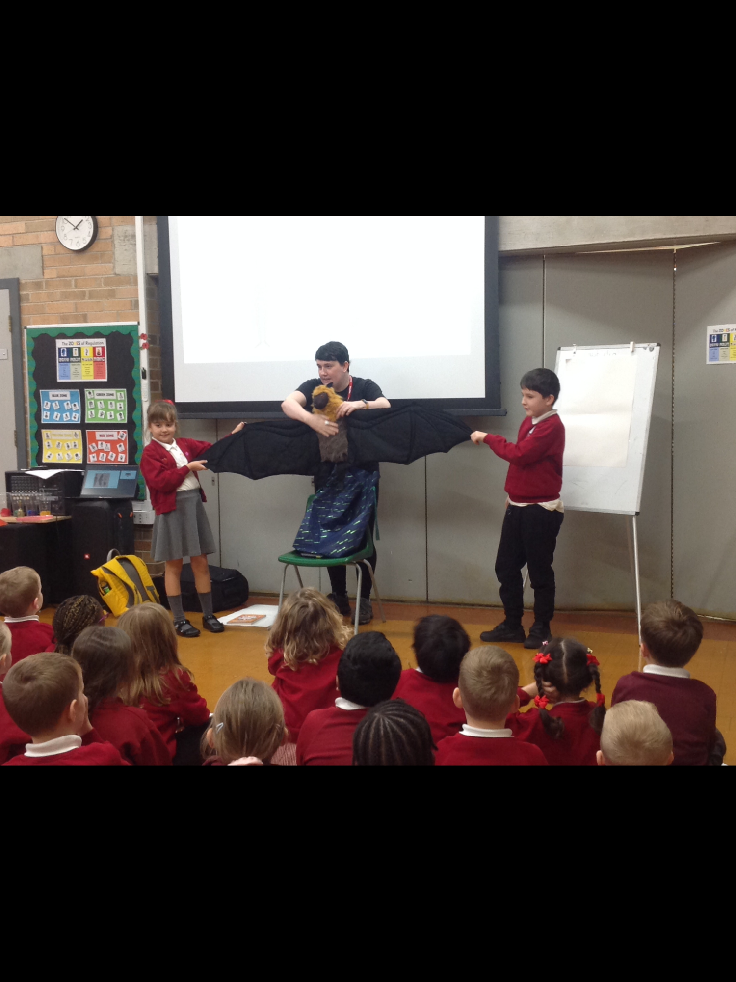 On Tuesday afternoon, Key Stage 1 were lucky enough to have a visit from author Emma Reynolds. She read her book, 'Amara and the bats' and taught the children lots of bat facts. For example, did you know that bats pollinate fruit and there are over 1400 different species of bat? Emma then taught the children how to draw a bat and even added a range of fun cartoon hats!